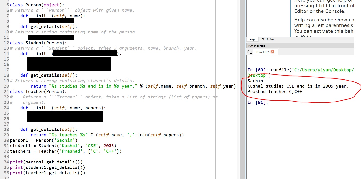 1. According to the given structure of the code and the given results,