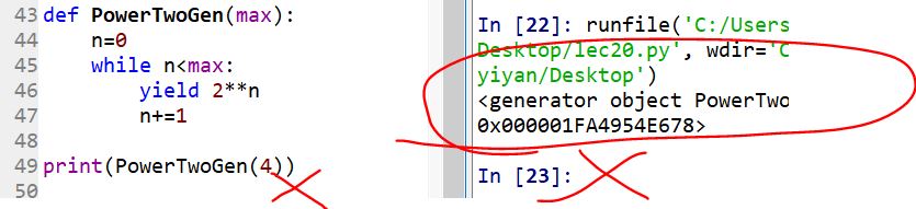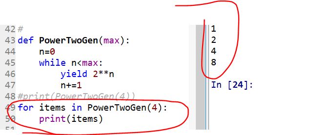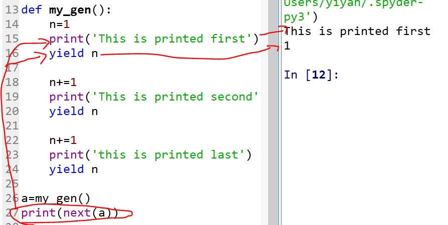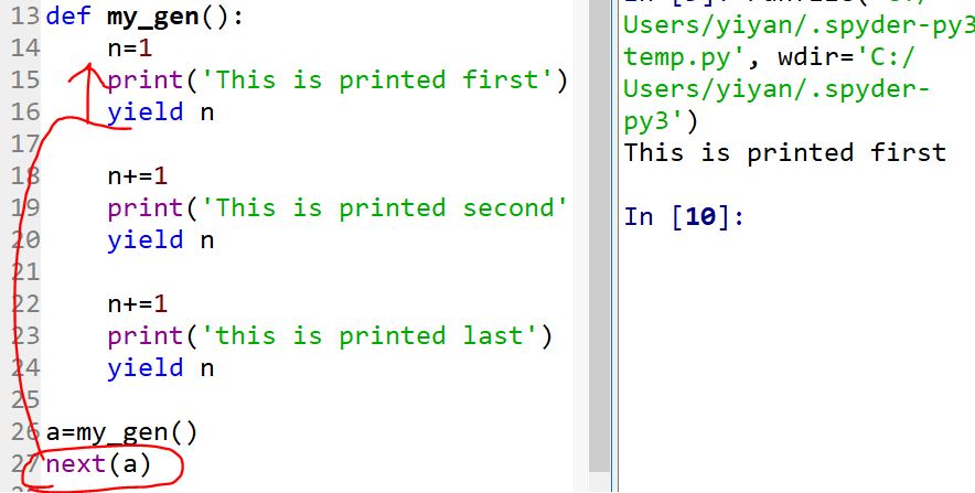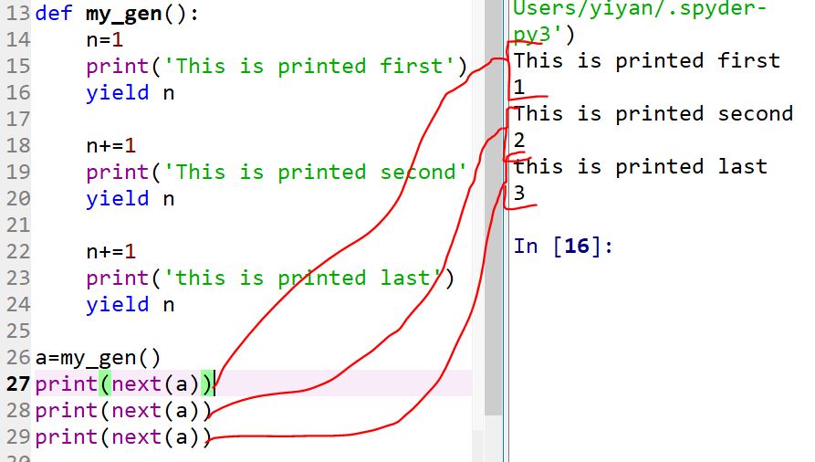 'yield n' actually returned 'n'. If I print the 'next(a)' funciton,