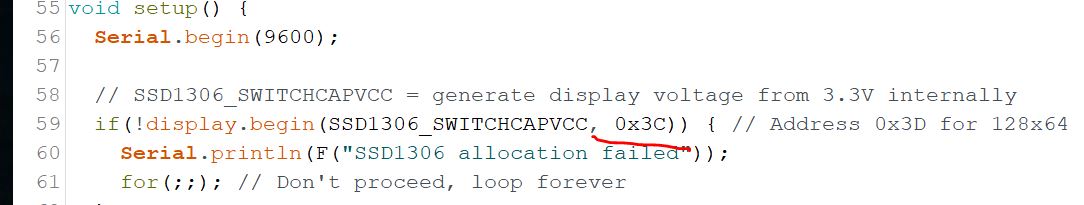 display.begin(SSD1306_SWITCHCAPVCC, 0x3C);// Address 0x3C for 128x64