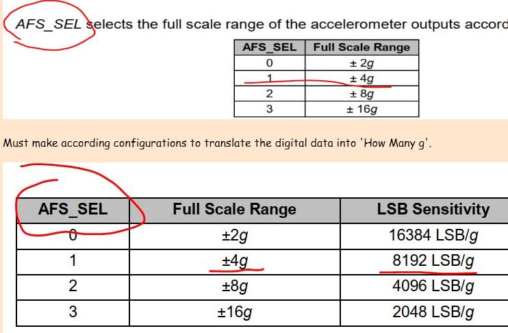 pre-determined factor (refer to the register Map PDF). Here, the range is 4g so you need to divide the