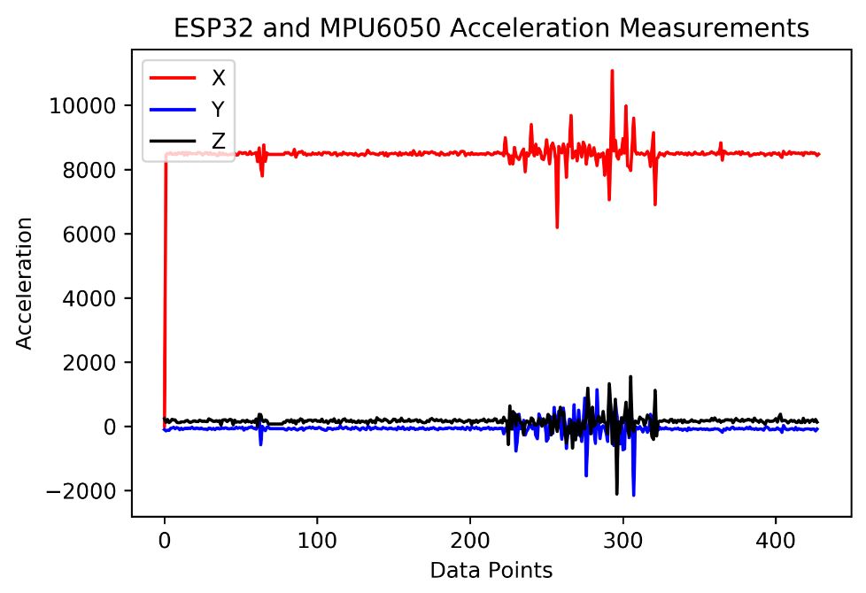 plt.title("ESP32 and MPU6050 Acceleration Measurements")
