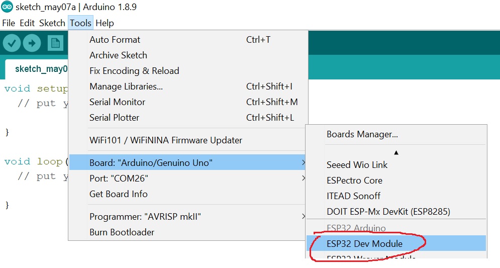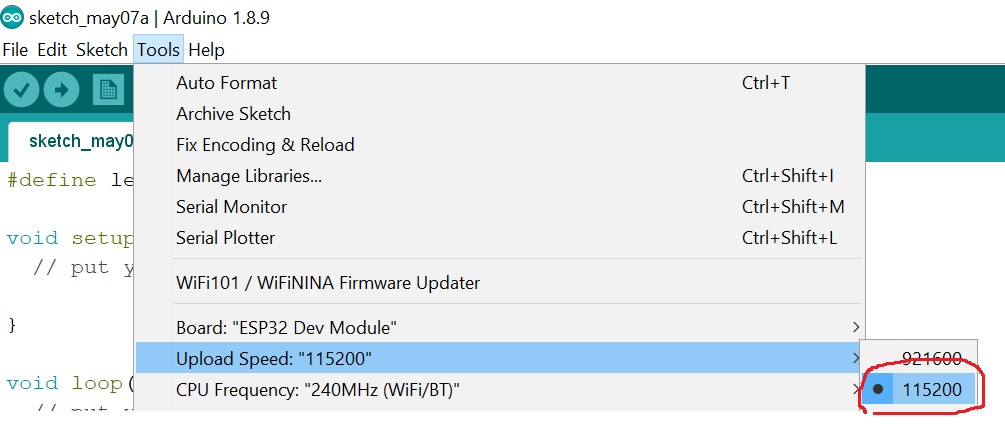 choose the 'ESP32 Dev Module' board, the '11520 upload speed', the