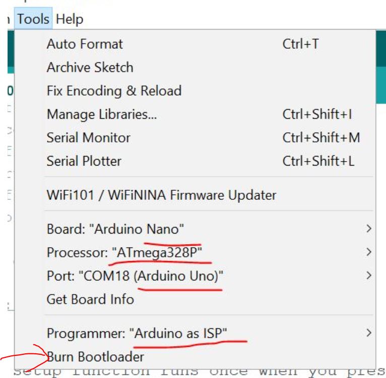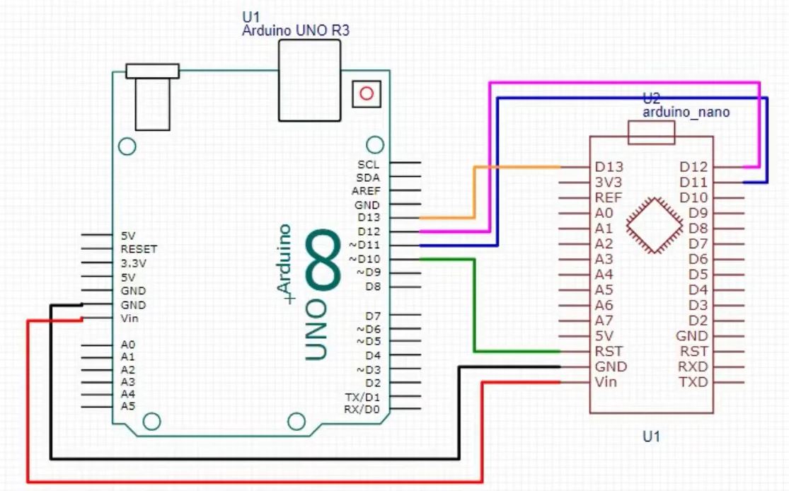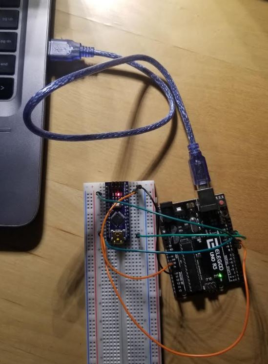 The following picture shows the connection before you burn the bootloader to your NANO from your UNO board.