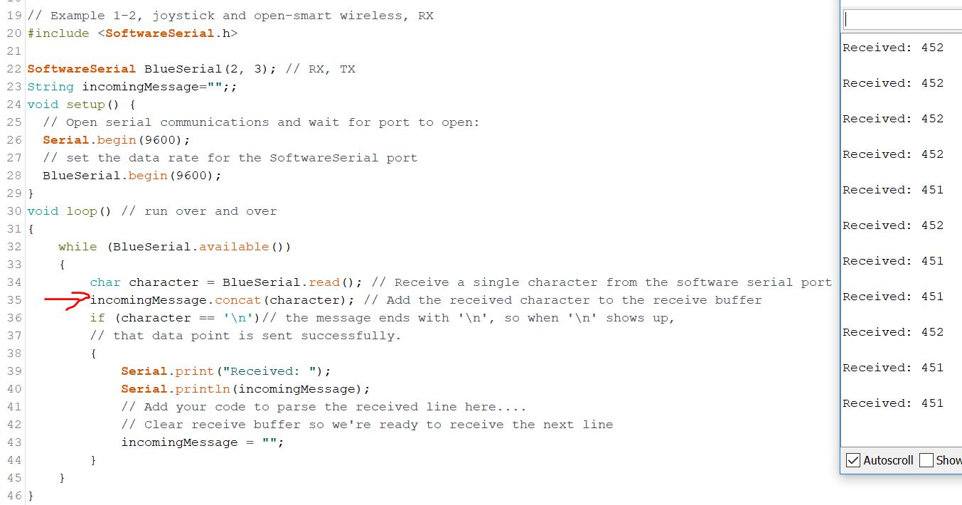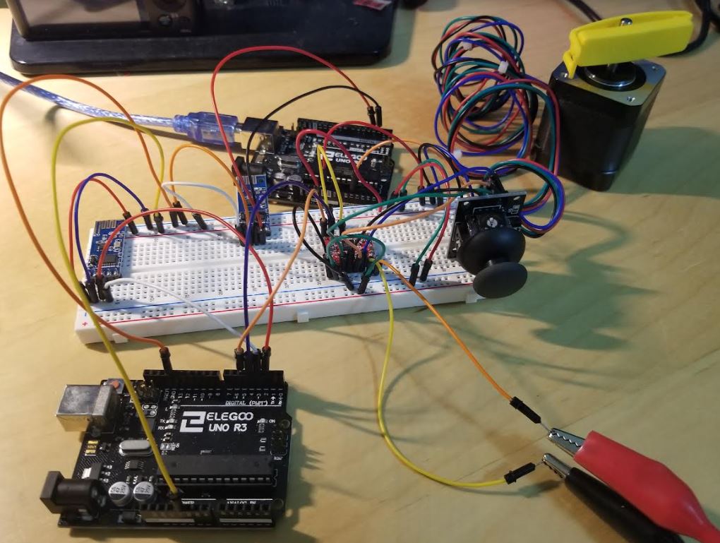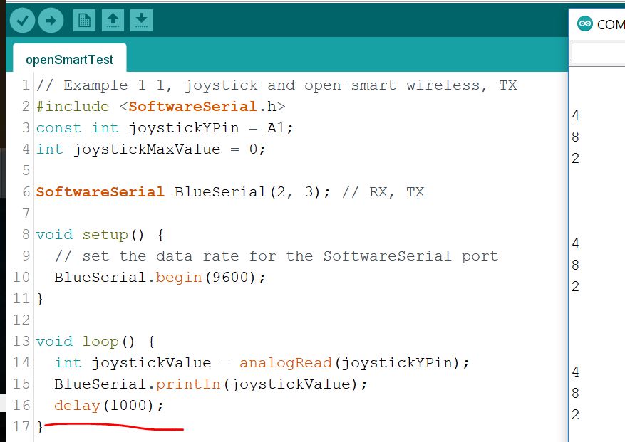Since Pin 2 and 3 are occupied by the SoftSerial ports, I used Pin 4 and 5 for Step and Dir respectfully. Here is the first sketch to just show the joystick works for the motor (openSmartTest3).