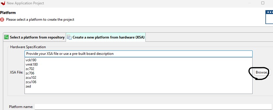 Create Application Project. Browse and add the xsa file here.