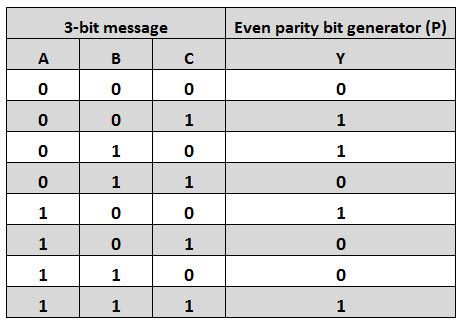 truth table of even parity generator in which 1 is placed as parity bit in order to make all 1s as even when the number of 1s in the truth table is odd.