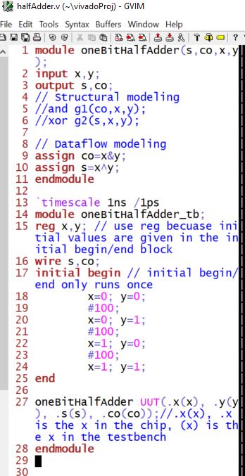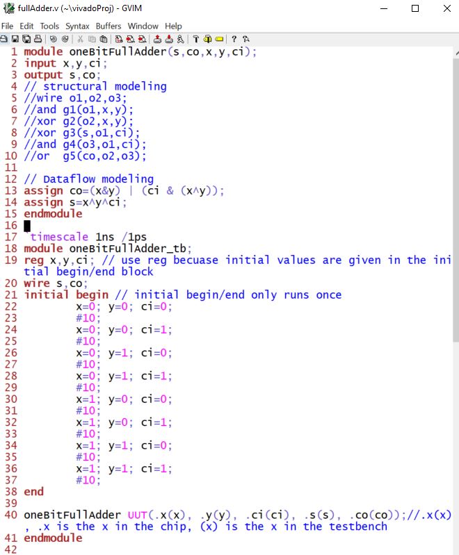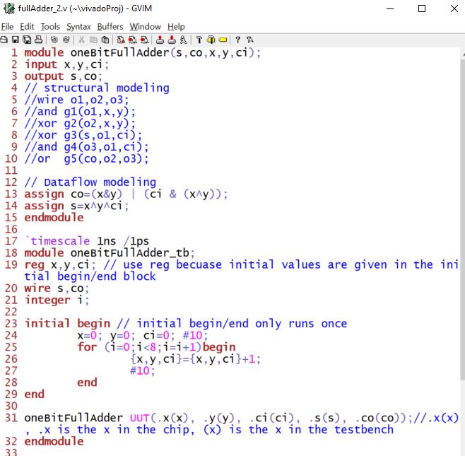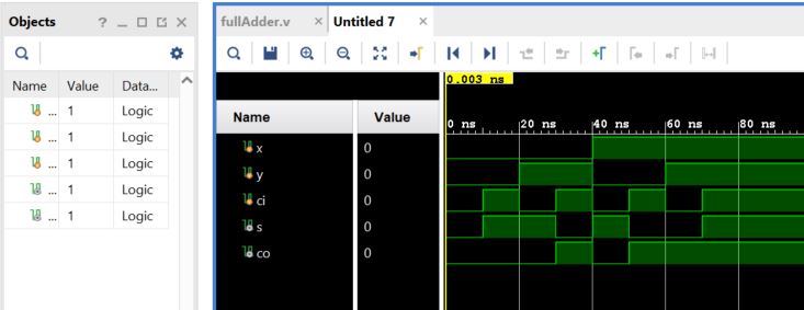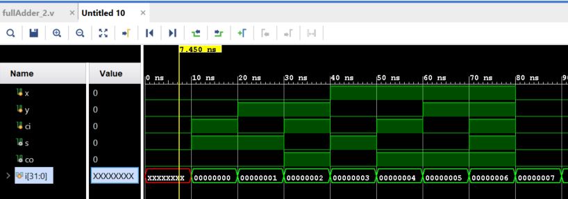 In the full adder testbench, when there are many simulation entries, you can use a for loop to simplify it.