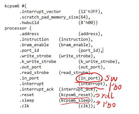 many other issues so I recommend you use the kcpsm6 design template for the port declaration. Definitely use kcpsm6.v as the CPU core.