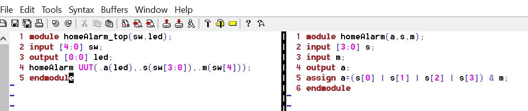 Also, open a new window using ':vert new homeAlarm_top.v' command.