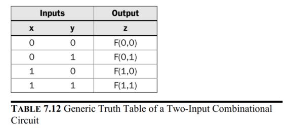 For two-input combinational circuits, the truth table and the LUT look like this: