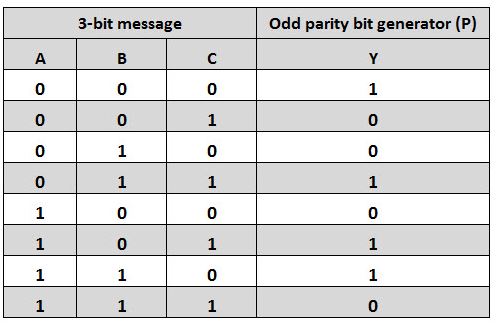 truth table of even parity generator in which 1 is placed as parity bit in order to make all 1s as even when the number of 1s in the truth table is odd.