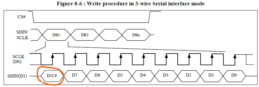 the order of D7, D6, ... D0. D/C# is sampled on every eighth clock and