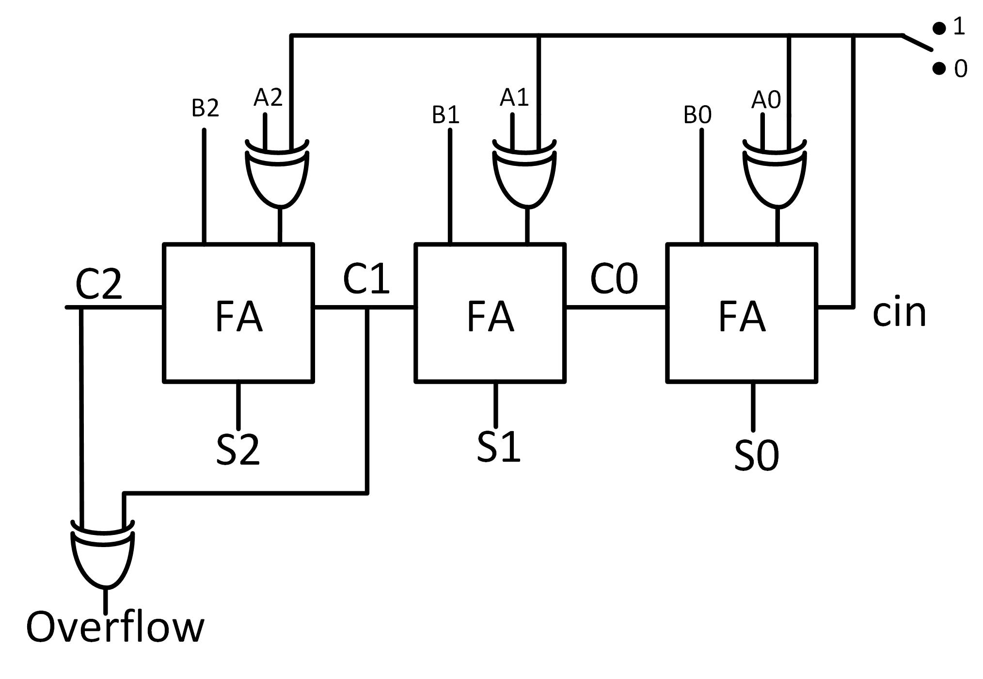 3-bit adder/subtractor in 2's complement: