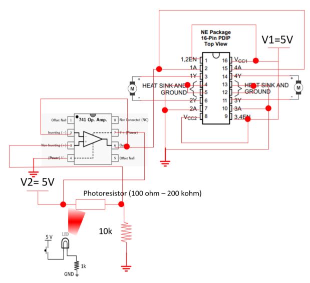 | Power supply Multimeter 1k resistors 10k resistors LED Push Button NE Package 16 pin PDIP Photoresistor DC Motor 741 OP AMP |