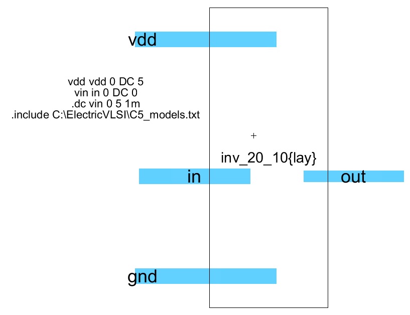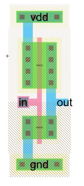 Figure 5. The simulation ready layout inverter with exported "vdd" and "gnd" pins and labeled in and out arcs.