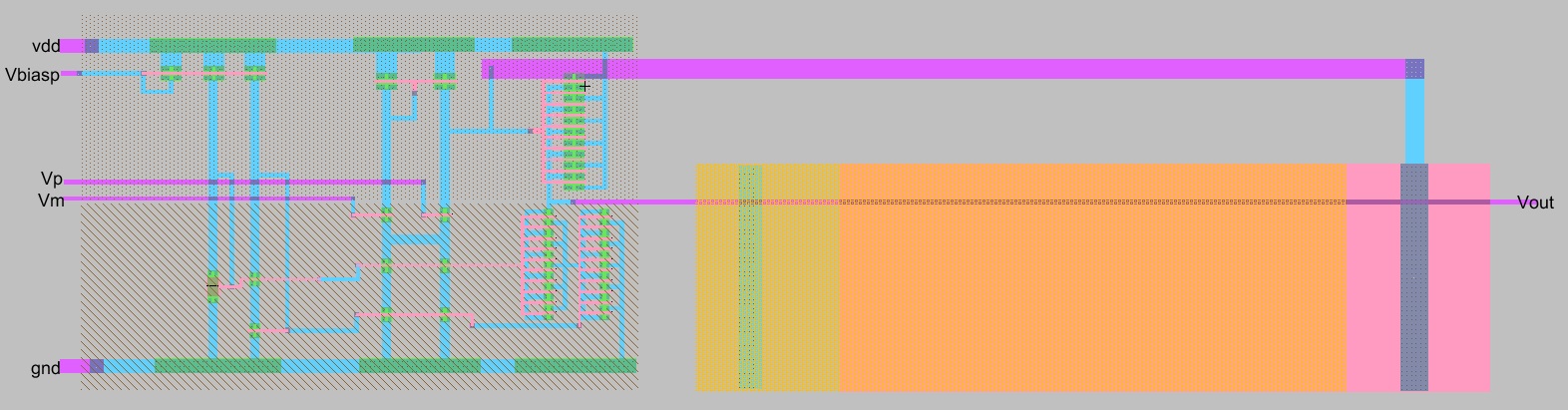 Completed Op Amp layout with biasing circuit and capacitor.