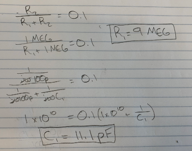 Figure 10. Calculations for finding the proper resistance and capacitance for 10x attenuation.
