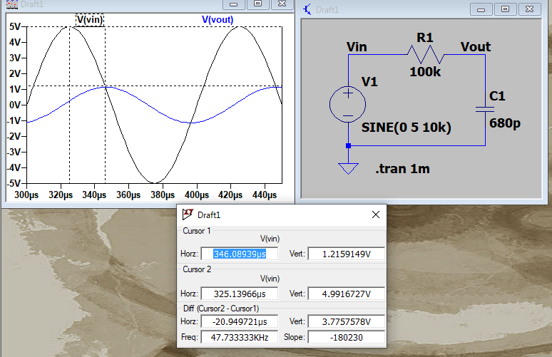 Figure 8. Simulation finding the time delay of the RC circuit. Similar method used for finding attenuation.