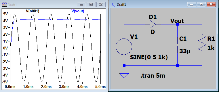 Figure 3. LTSpice simulation results for the half wave rectifier, now with a built in voltage of 0.6V.
