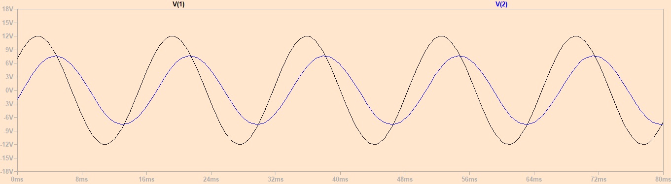 | Task 2 V1 0 1 SINE(0 12 60 0) R1 1 2 30 C1 2 0 100u .tran 0 1 0.01 |