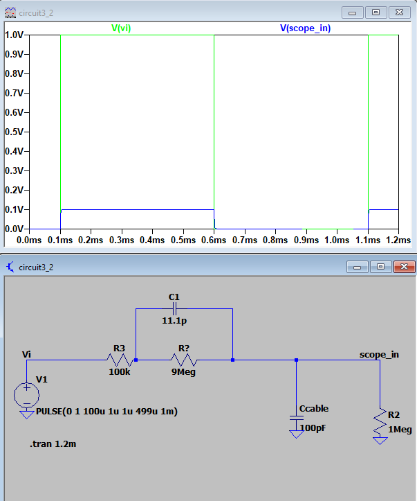 F14: The LTSpice simulation of the compensated probe circuit with 10x DC attenuation.