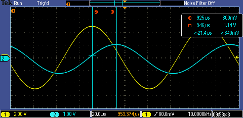 was then given a sine wave with a frequency of 10kHz. The time delay of