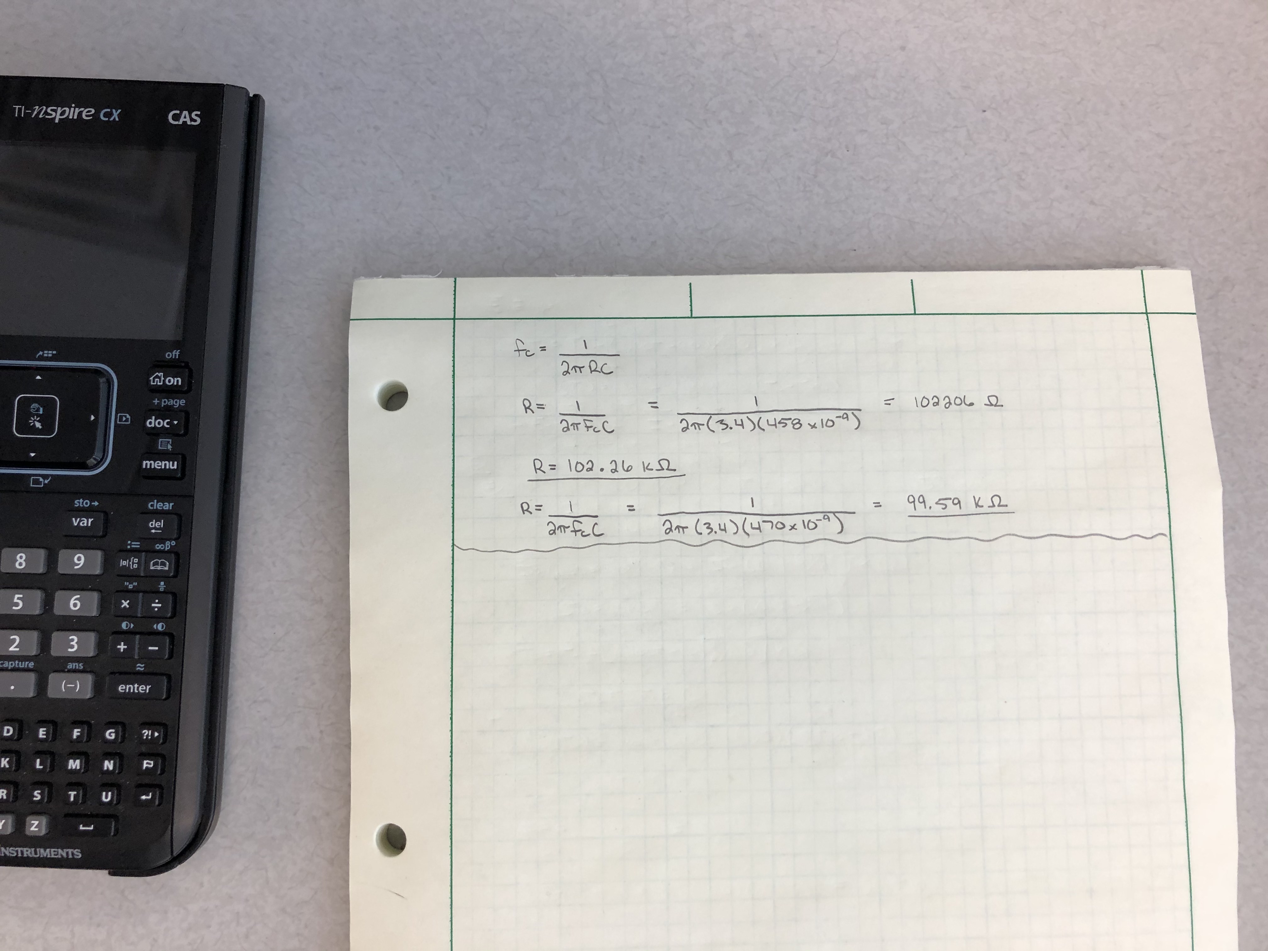 Figure 12: The had calculations for the resistor values used in the High and Low Pass Filters.