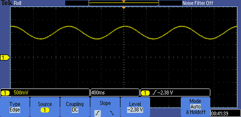 Figure 2: The 500 mVpp, 1 Hz, 1 V DC sine wave signal being observed on the oscilloscope in AC mode.