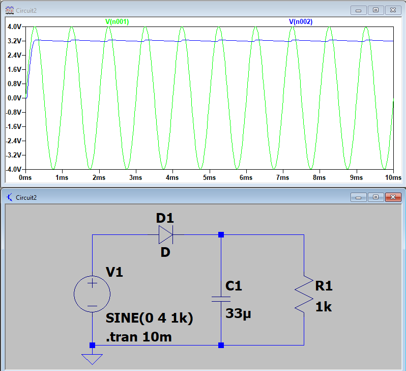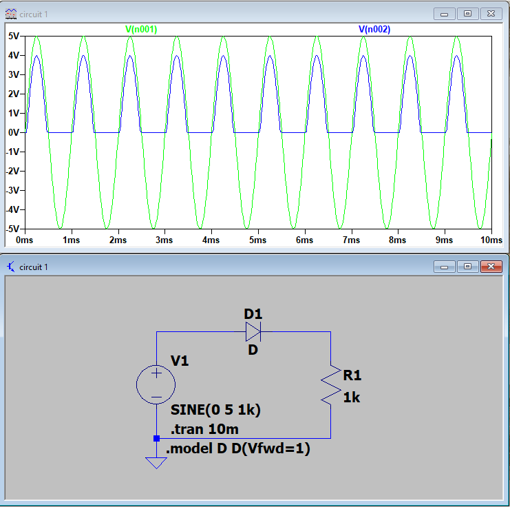 Figure 2. The LTSpice simulation of the half wave rectifier with a bulit in voltage of 1 Volt.