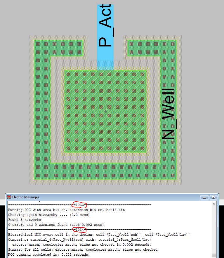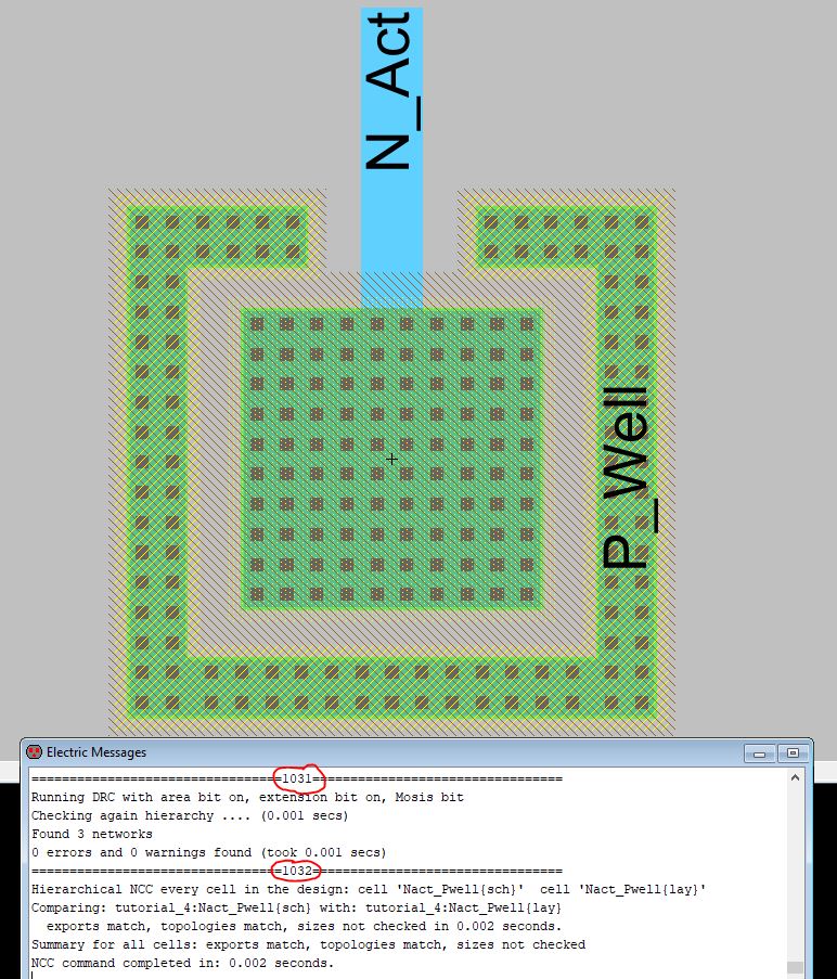 Figure 1: The layout view of the Nact_Pwell and the electric message dialog box showing there were no errors on the component