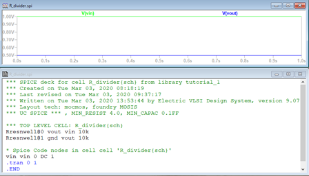 Electric VLSI uses files that contain schematic, layout, and other things under one program name, cells and libraries. To start a new project a new cell must be made. This lab used 300nm technology. With a new cell, a schematic and layout can be created. On the Schematic, a n-well resistor is selected and dropped into view. Dimensions of the resistor are set to 15 width and 187.5 length. On the layout, a n-well resistor is added to the view. Dimensions are set to L = 187.5, W = 15. Another Resistor is added to both schematic and layout and they are wired together using an ARC. LTSPICE is then used to simulate and prove the circuit works.