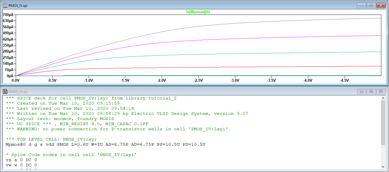 Figure 6. The LTSpice simulation conducted for the completed PMOS MOSFET as prescribed in Tutorial 2.