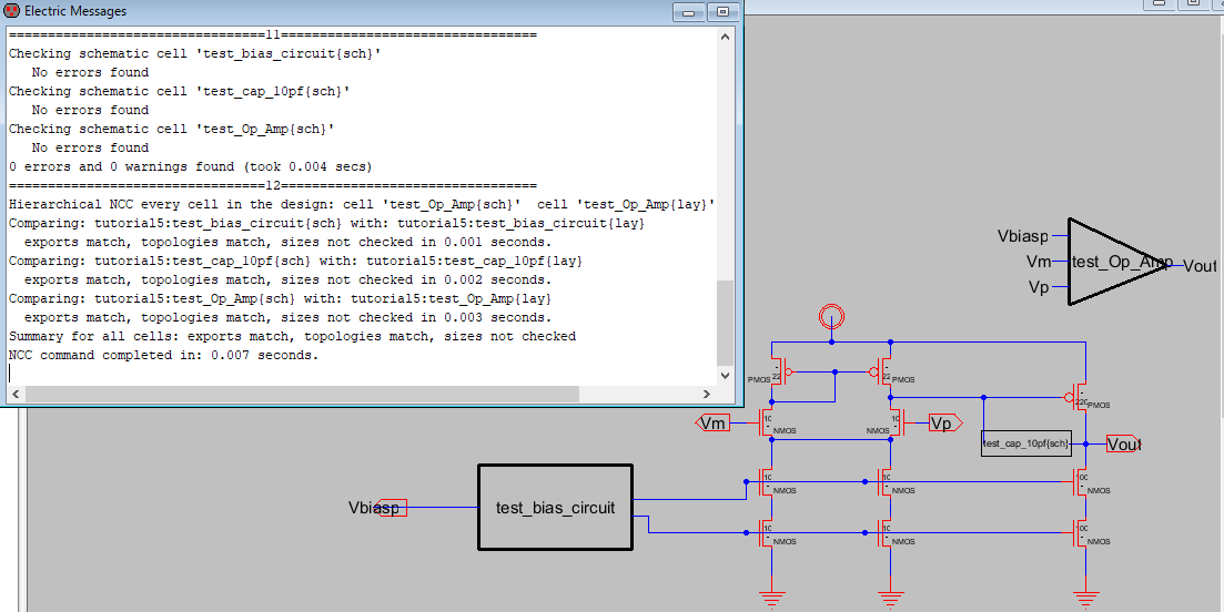Figure 3 shows the schematic of the op amp circuit, and Figure 3a shows the layout view. As seen in the figures, DRC and NCC are clean.