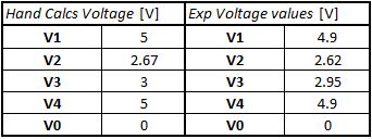 The experimental and hand-calculated voltages for the circuit in problem 1 are shown in Table 2, below.