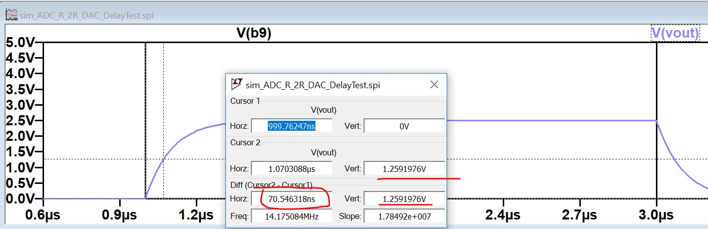 show two cursors. Probe the 1.25 V of the out put for the time delay).