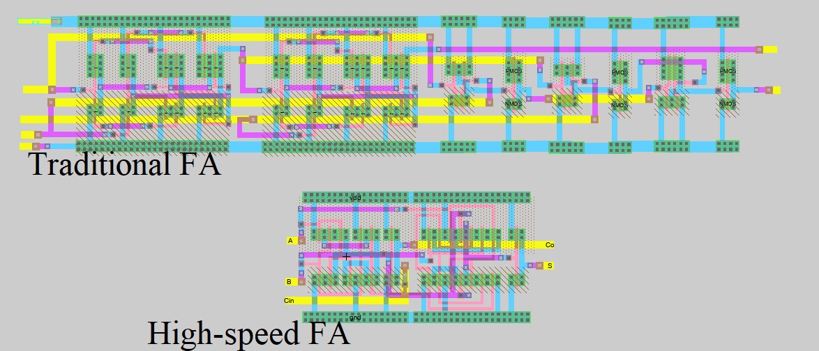 Next, the layout of the high-speed full adder. The trick of organizing