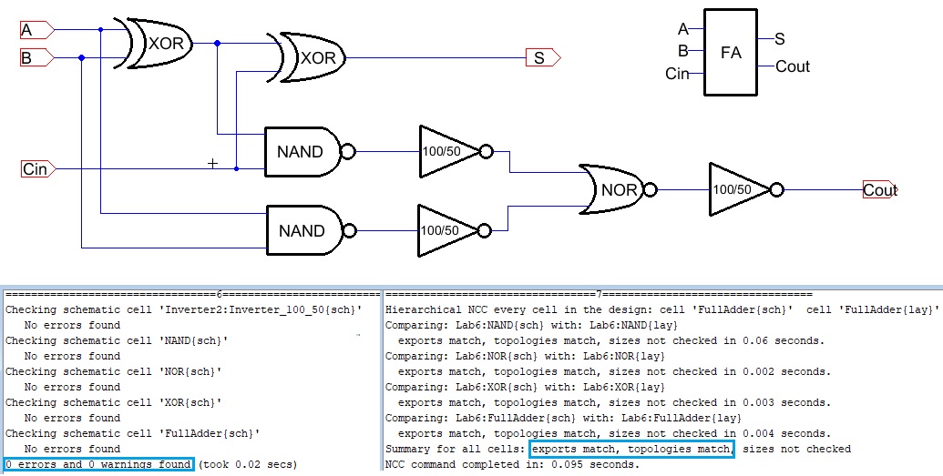 Figure 12. Full Adder layout with NCC, DRC, and well check results.