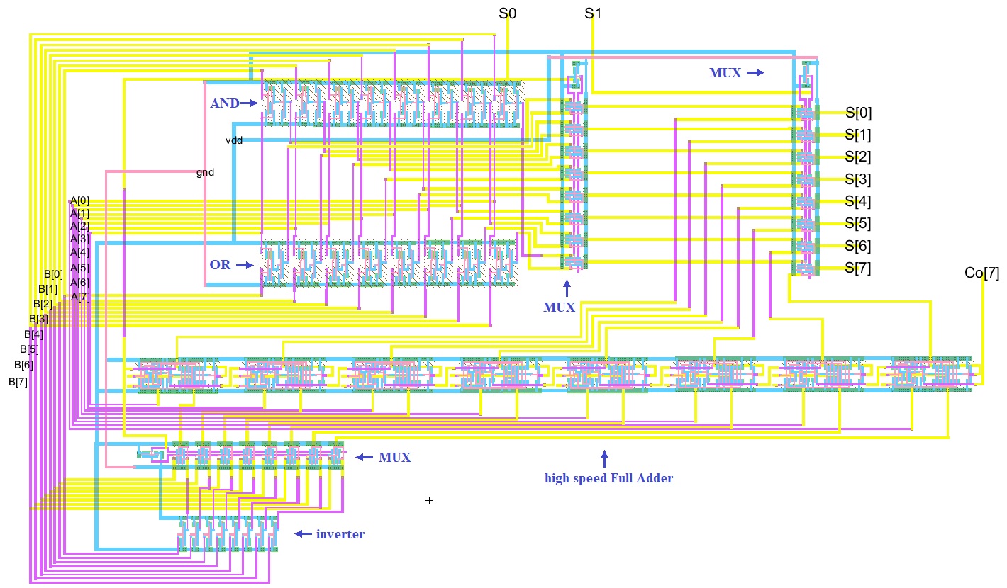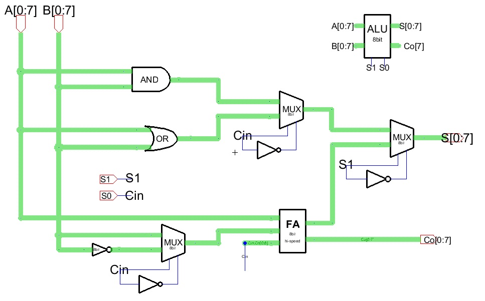 8bit ALU layout. A[0:7] and B[0:7] inputs are on the left. S0 and S1