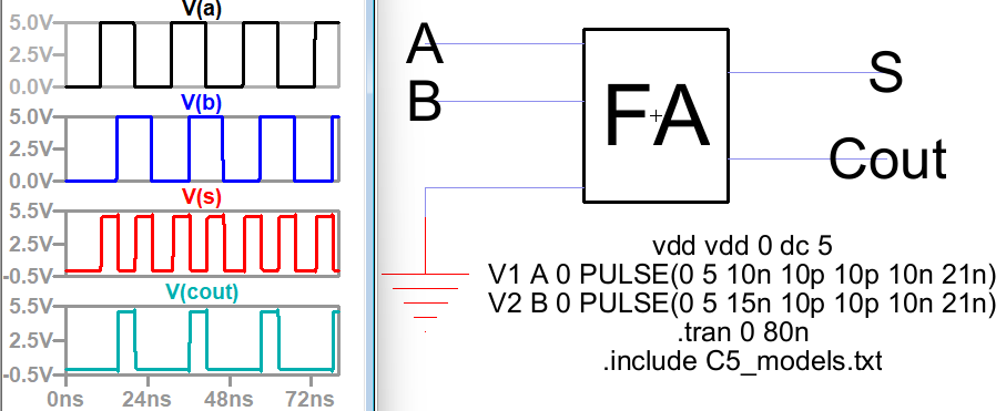 Figure 8: Full-adder icon, simulation and results.