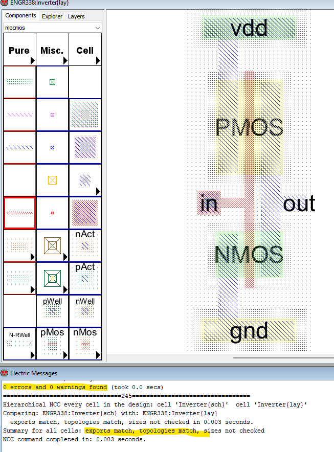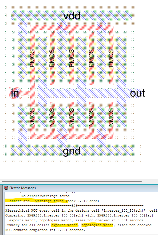 Figure 3: Layout of the inverter created in Electric, also, showing no errors.