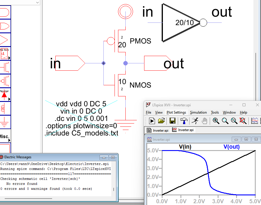 Figure 1: Inverter schematic created in Electric, its icon, DRC check, and simulation results.
