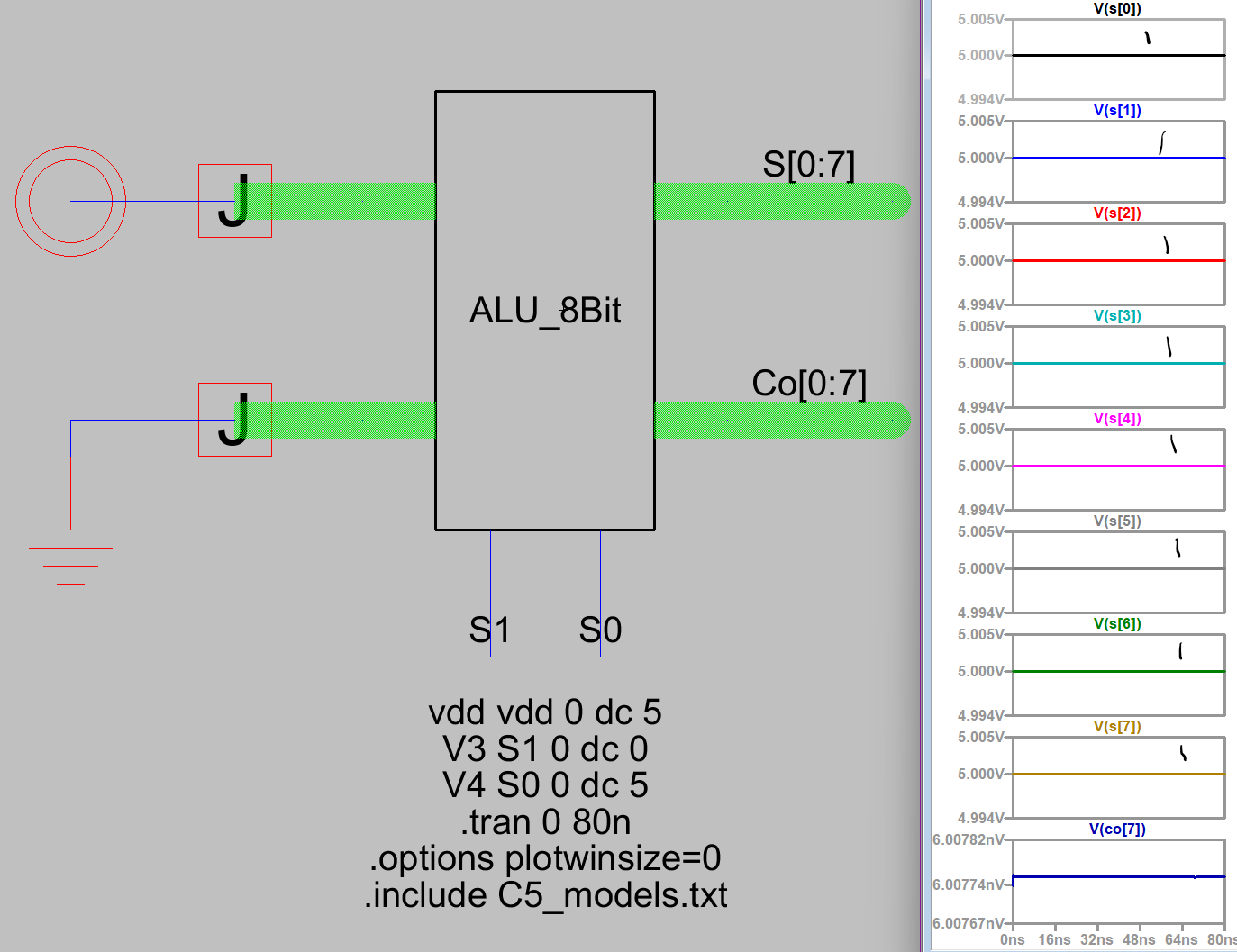 Figure 7: Simple 8-Bit ALU ADD function and simulation results.