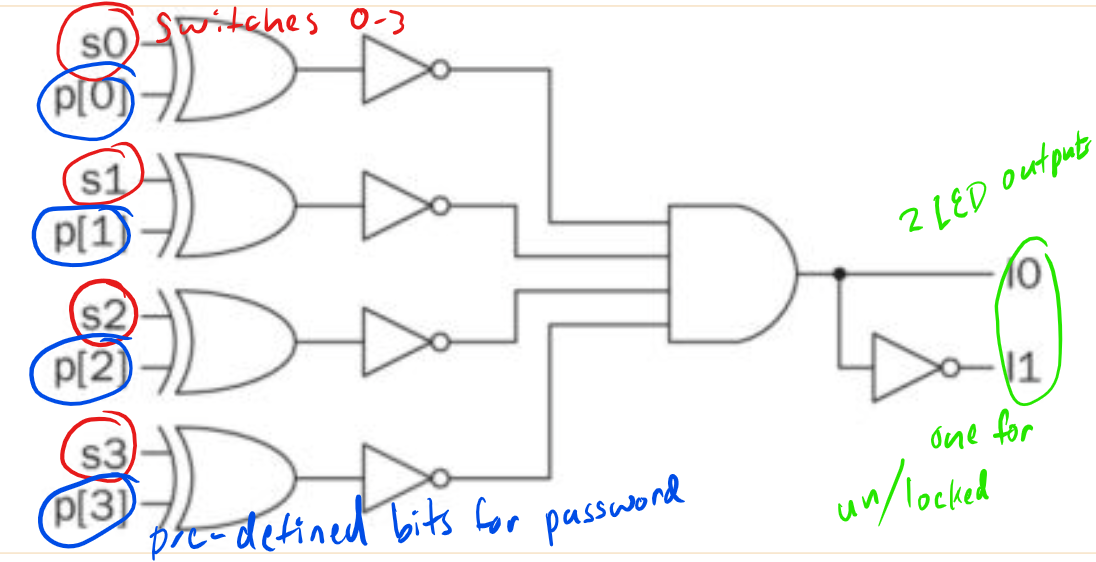 This is designed to mimic a simple password system using the switches to match a pre-defined 'password' of bits.