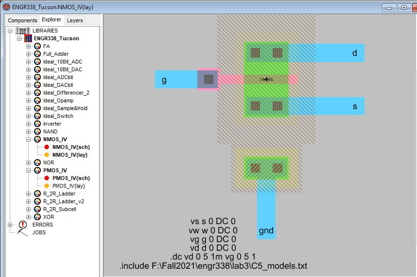 Figure 3. A screen-snip of the final layout with SPICE simulation code and connections for NMOS_IV{lay}.