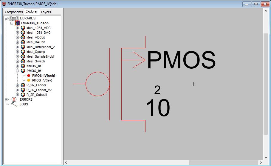 Figure 2. A screen-snip of the schematic for PMOS_IV{sch}. The width of the transistor has been set to 10 lambda, and the length has been set to 2 lambda. The format of the text has been altered from the default format.