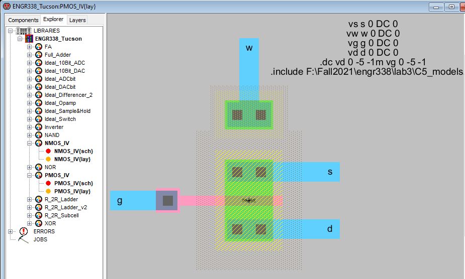 Figure 4. A screen-snip of the final layout with SPICE simulation code and connections for PMOS_IV{lay}.