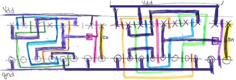 Figure 1. This is a stick diagram of the 1-bit Full Adder I designed. The circuit on the left is the circuit for the Carry-out bit, and the circuit on the right is for the solution bit. Gates with input A are highlighted in blue, Gates with input B are highlighted in green, and Gates with the Carry-in input are highlighted in orange. The pink highlighting is for NOT-Carry-out, and the purple highlighting is for NOT-Solution. The yellow highlighting indicates both Carry-out (left) and Solution (right) outputs.