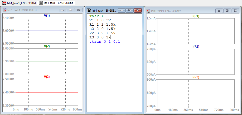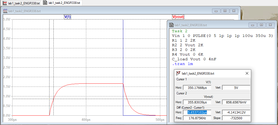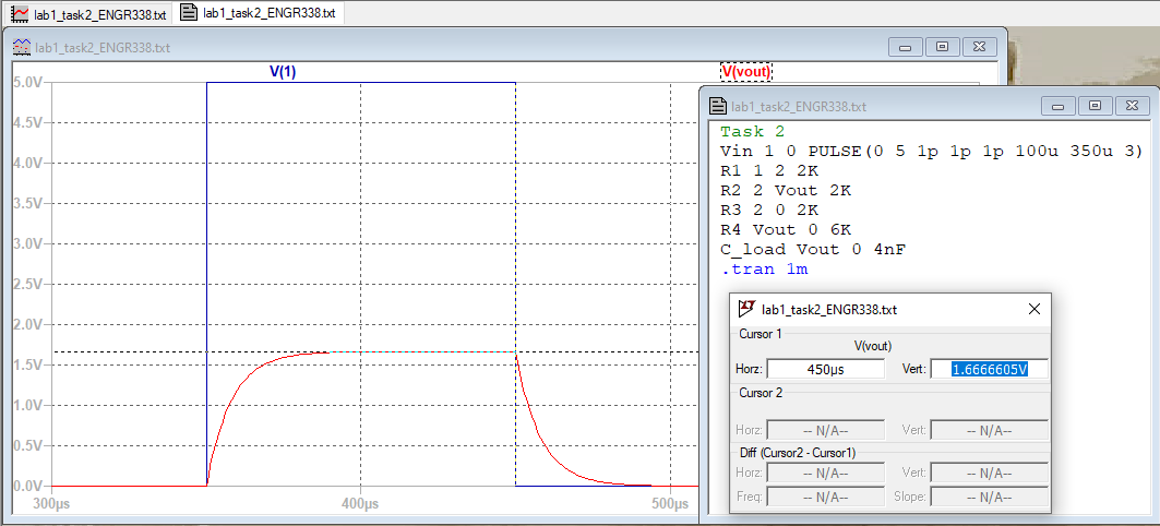 The simulation results represented in the figure for Task 2, as seen in the Results section, match the values that I calculated by hand, as seen in the PDF for Task 2 in the Procedure section.