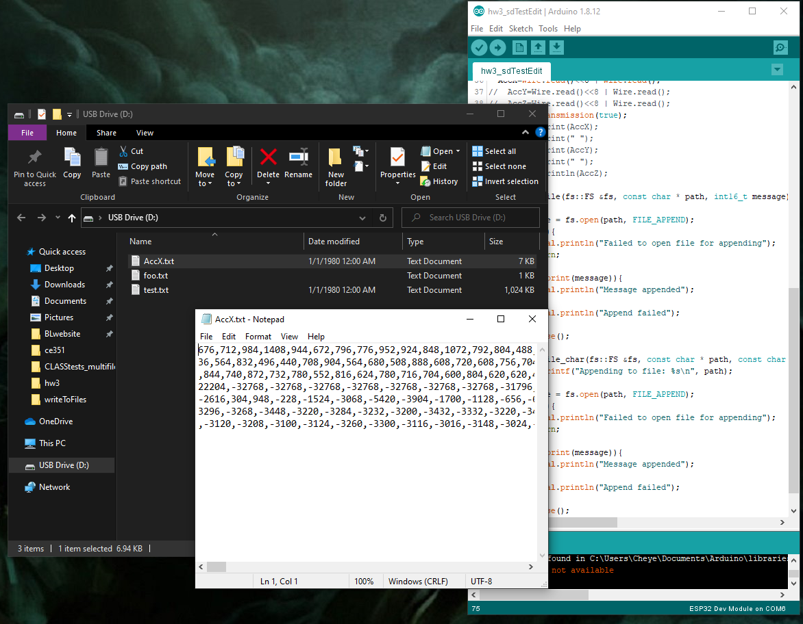 The code was modified to store the data from the X, Y, and Z axes