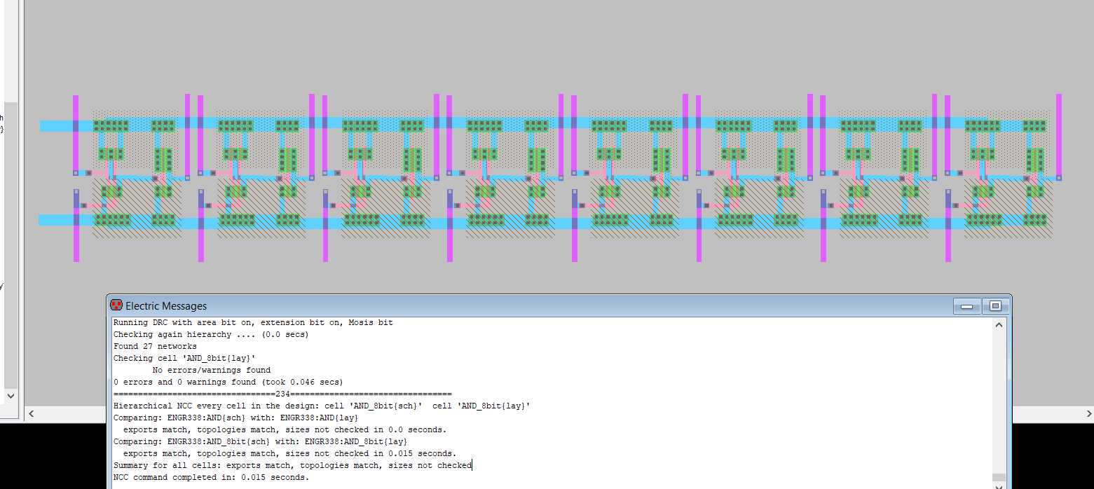 Figure 9: Shows the full layout of the 8-bit AND gate with no errors after running DRC and NCC